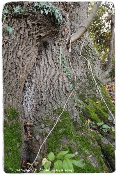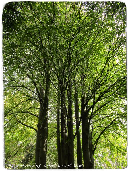 Tiliaceae: A tall deciduous long-lived tree to 130ft (40m). The bole is normally free of suckers and shoots, distinguishing this species of lime. The bark is dark grey with fine fissures in older trees. The leaves are normally around 9cm long, sometimes to 15cm long, broadly ovate, with a short tapering point and irregularly heart-shaped base. The yellow-white flowers usually open around June, followed by a hard-woody fruit up to 1.8cm. native to lime-rich soils of mainland Europe; in Britain it is native to central and southern England and Wales, having been introduced elsewhere; often planted as a street tree.